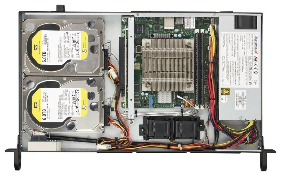 ストレージオプションとして内蔵ドライブベイに3.5インチHDDドライブを最大2基、またはIntel社製データセンタ向け2.5インチSSDを最大4基搭載可能です。
