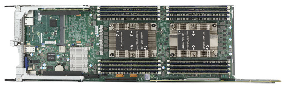 各ノードは最大1.5TBのECC対応DDR4メモリを搭載可能です。ネットワークは10Gbpsイーサネットに対応しています。ホットスワップ可能な2.5インチドライブベイをノードあたり4基搭載しており、専用RAIDカードと組み合わせて利用することも可能です。さらに拡張PCI-Eスロットも備えており、サーバ製品として機能や拡張性に遜色はありません。