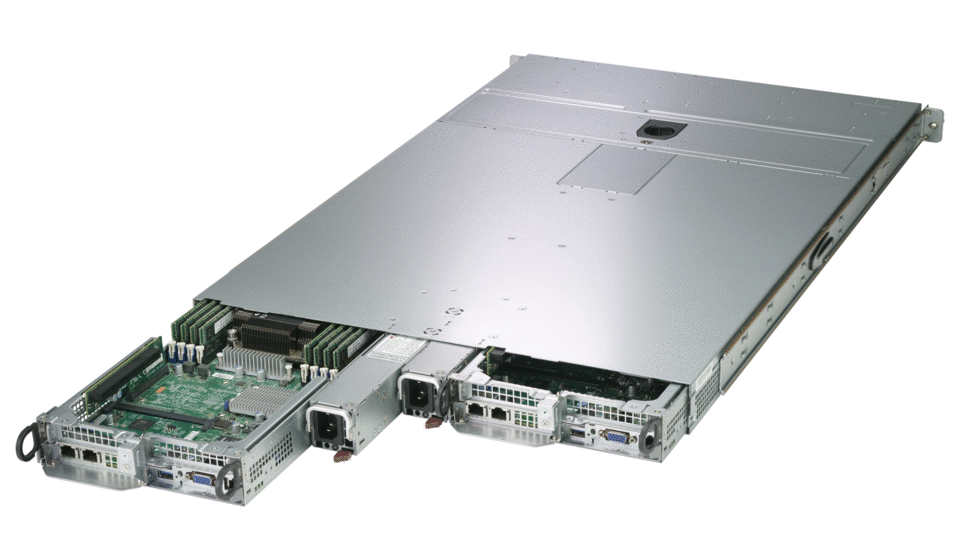 1Uサイズの筐体に2台分のサーバ機能を収めることにより、システム1つあたりの導入コストやデータセンタでの維持コストを低く抑えることが可能です。各ノードはそれぞれ1台の独立したサーバとして通常のサーバと同様な使い勝手で、他のサーバからの移行も容易です。従来の1Uサーバの使い勝手をそのままに必要なサーバラックの容量を半分にした製品となっており、新規エンタープライズ環境を構築する場合はもちろん、従来のエンタープライズ環境のアップグレード先の選択としても最適です。