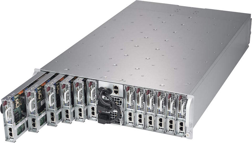 第9世代 Intel Xeon E-2200プロセッサを搭載したマルチノード3Uサーバです。1CPU対応のノードを12台搭載します。13GHz(3.4GHz x 4コア)から29.6GHz(3.7Hz x 8コア)までのCPU性能をサポートします。Xeon E-2200プロセッサは低価格ながらセキュリティ機能も備えた高性能サーバ向けプロセッサです。それぞれのノードは最大64GBのECC対応DDR4-2666メモリを搭載可能です。標準で2ポートの1000Base-Tのネットワークインターフェースを搭載しています。10GBase-T ネットワークインターフェースにも対応可能です。
